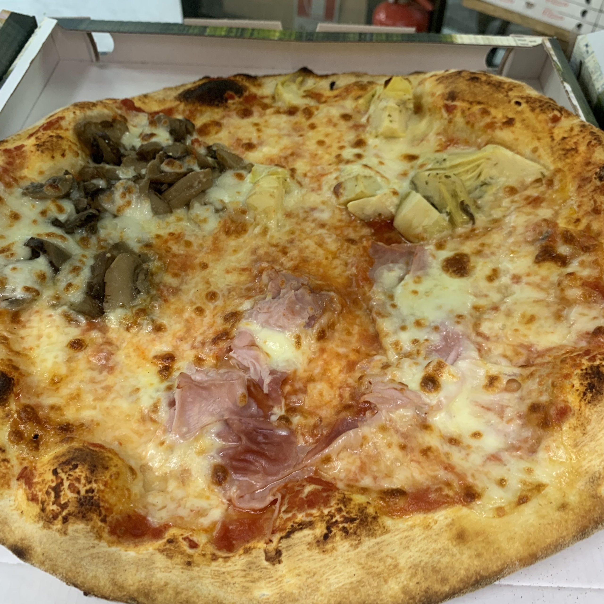 Pomodoro, Mozzarella, Prosciutto, Funghi, Carciofi
